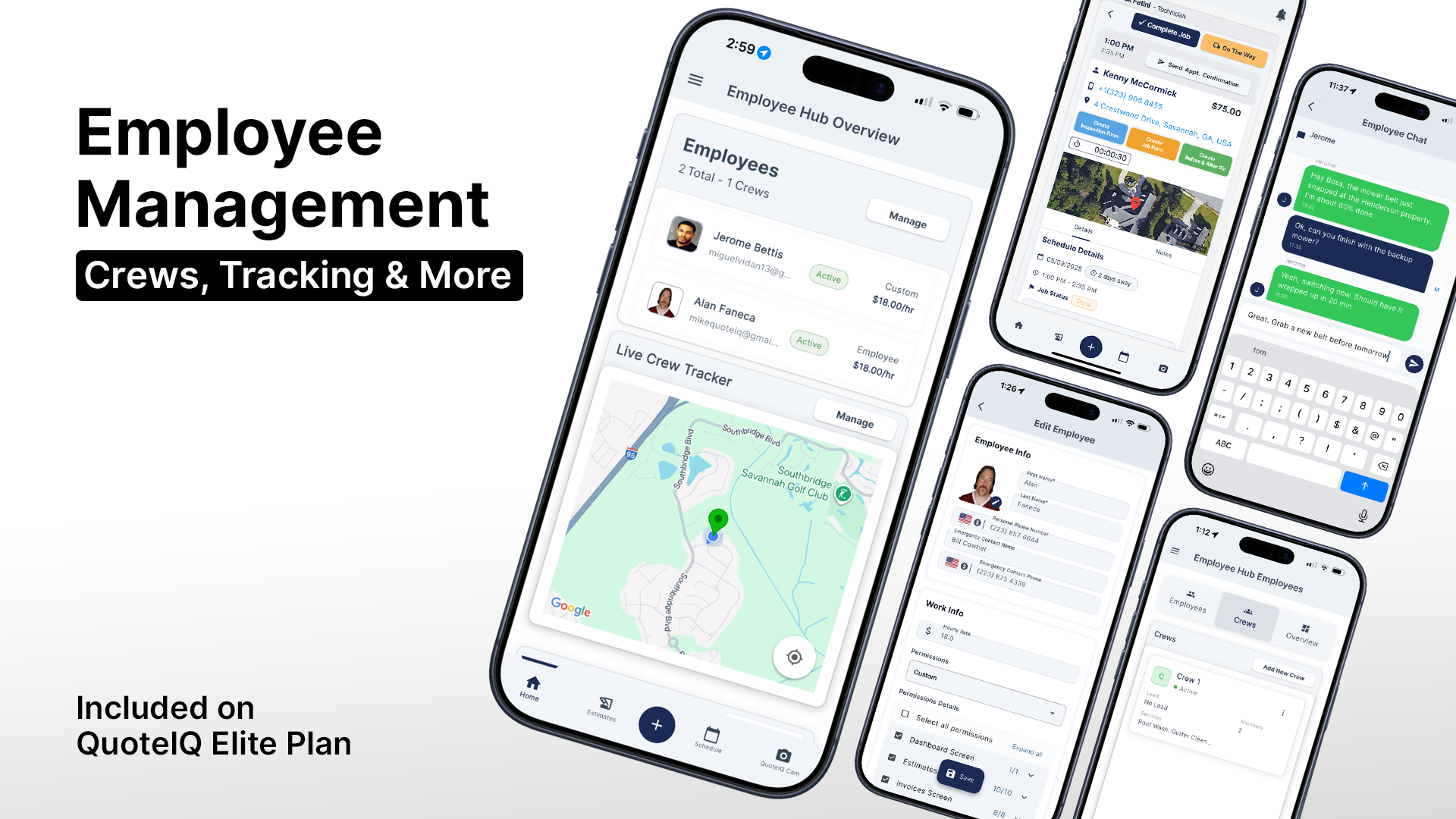 Add employees, create crews, assign jobs, track hours, monitor locations, and communicate — without ever leaving QuoteIQ.